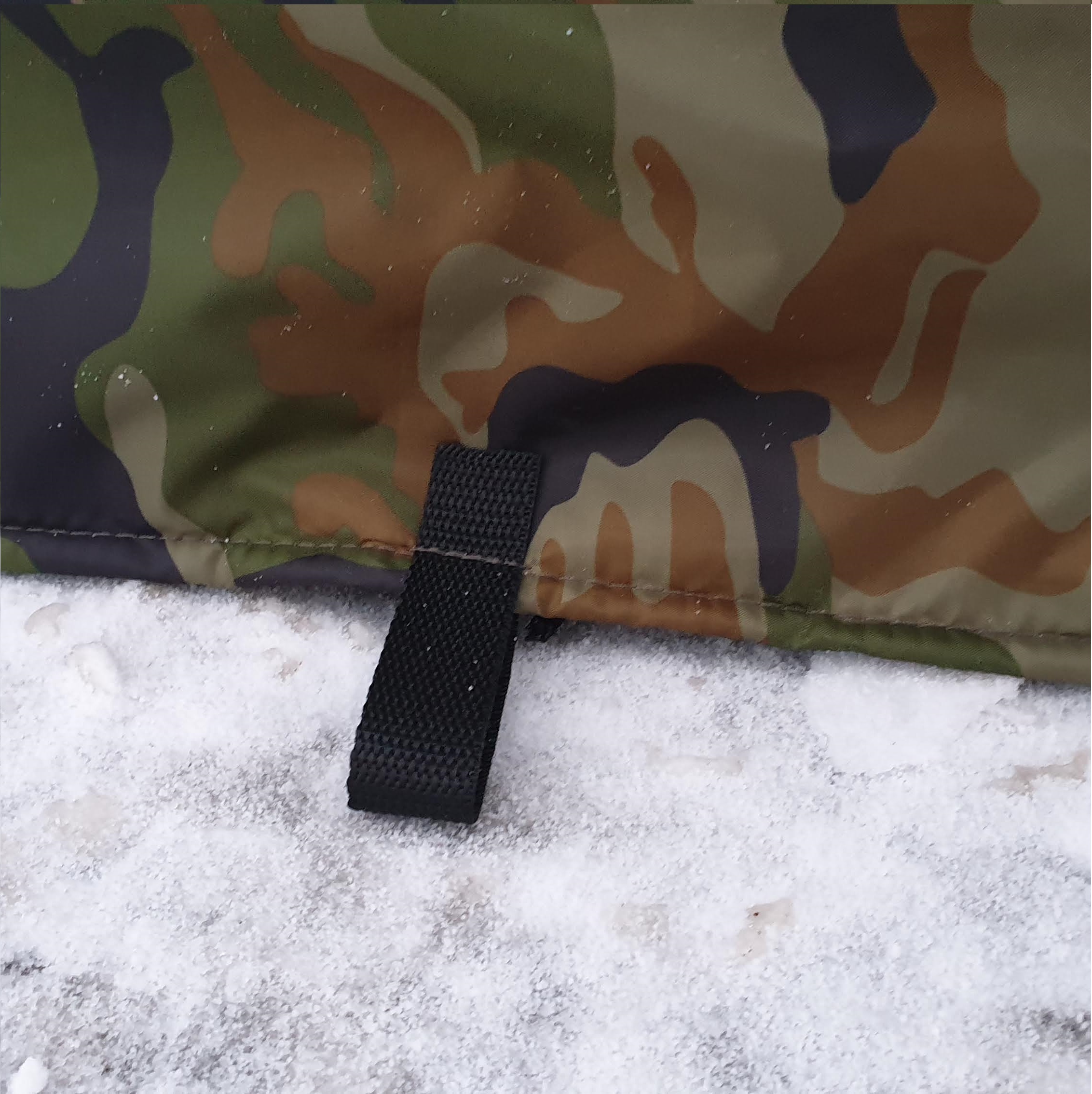 Петли из ременной ленты спереди и сзади, для крепления к колесам шнурками. И дополнительные петили по бокам, для более надежной фиксации тента под днищем автомобиля. |