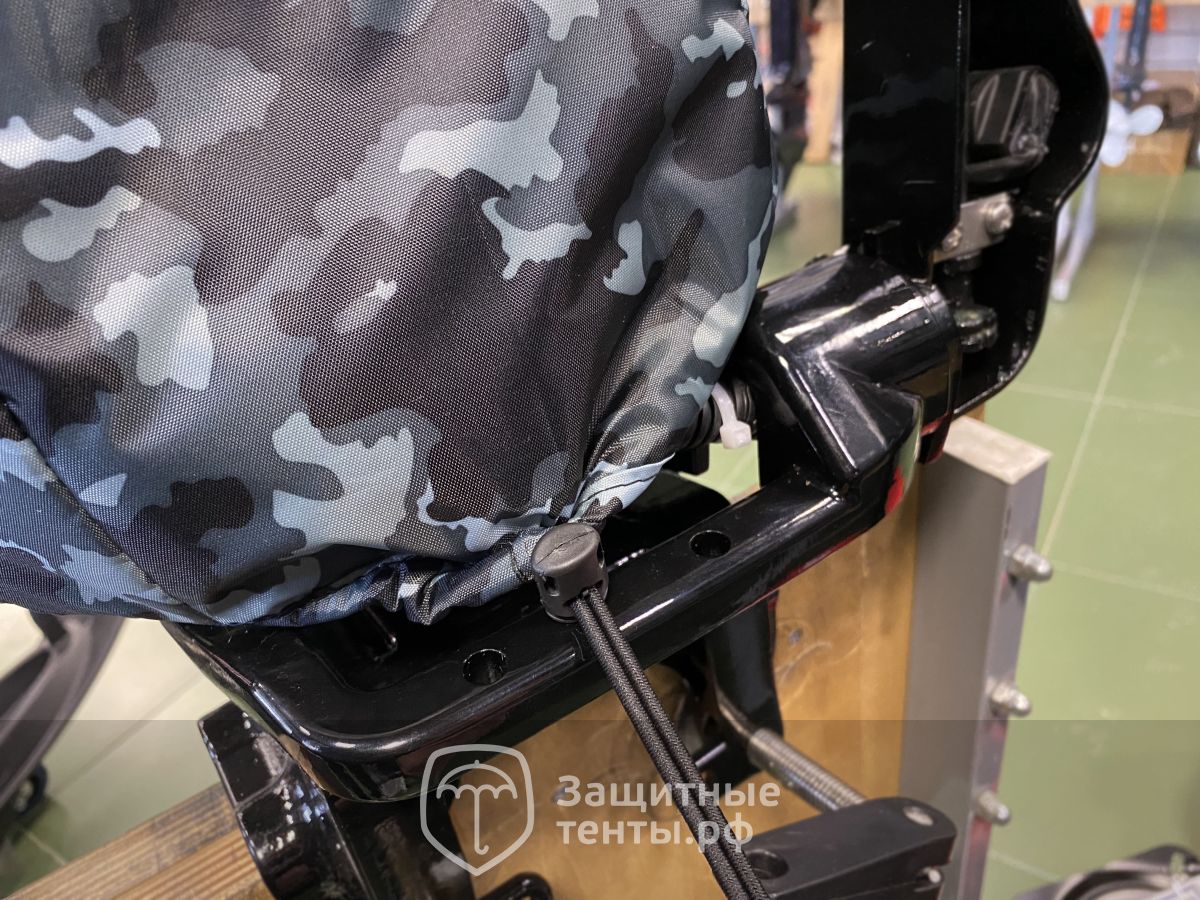 Одевается на крышку мотора и не требует дополнительных креплений, снизу по периметру утягивающая резинка.